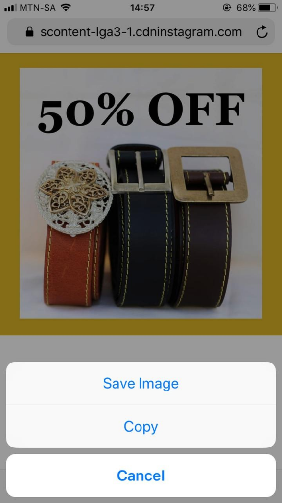 3. The image you are wanting to repost will pop up on your screen and you can select Save Image. The image is now saved to your camera roll.