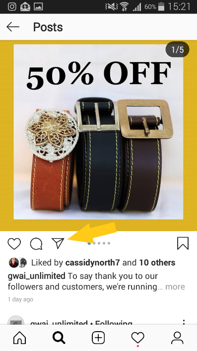 1. Find the post you would like to share and click on the aeroplane icon under the image.